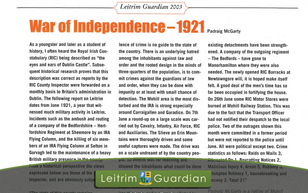 109 – War of Independence | LG2003 [Go Back] PDF File Type: pdf Categories: 2003 Tags: Historical, Local History Author: Padraig McGarty Downloads: 2