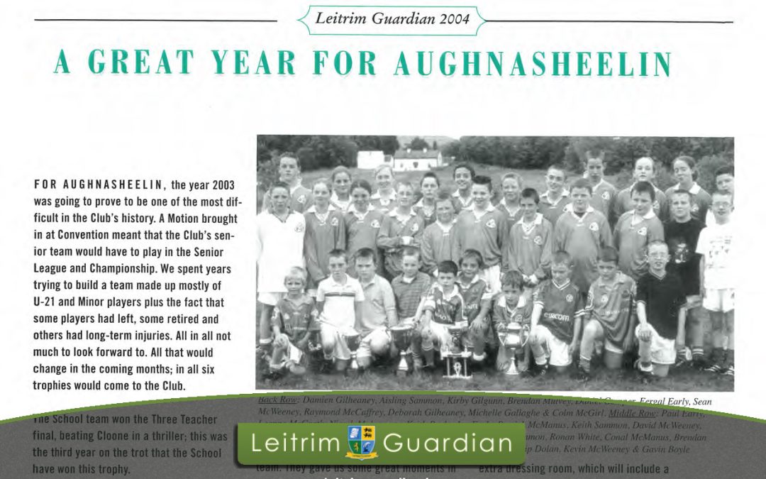 160 – A Good Year for Aughnasheelin | LG2004 [Go Back] PDF File Type: pdf Categories: 2004 Tags: Community, Community Development, GAA, Gaelic Football Downloads: 2