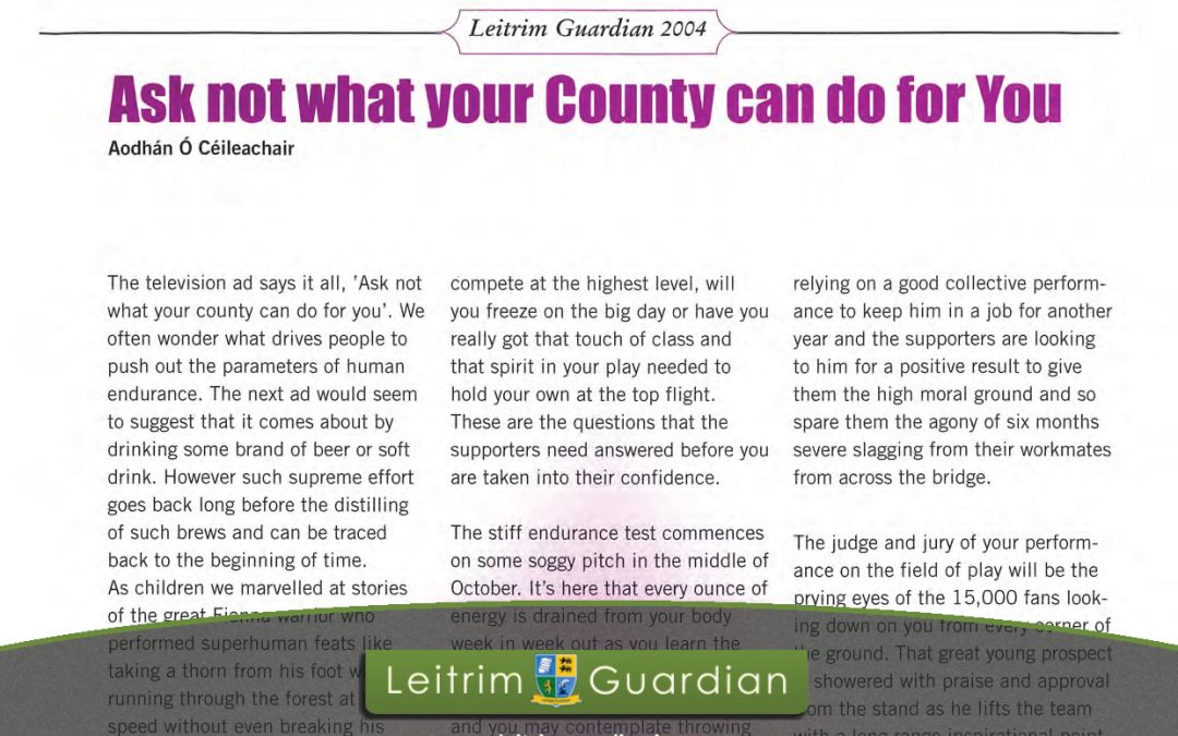 45 – Ask not what your County can do for you | LG2004 [Go Back] PDF File Type: pdf Categories: 2004 Tags: GAA, Gaelic Football, Sport Author: Aodhán Ó Céileachair Downloads: 1